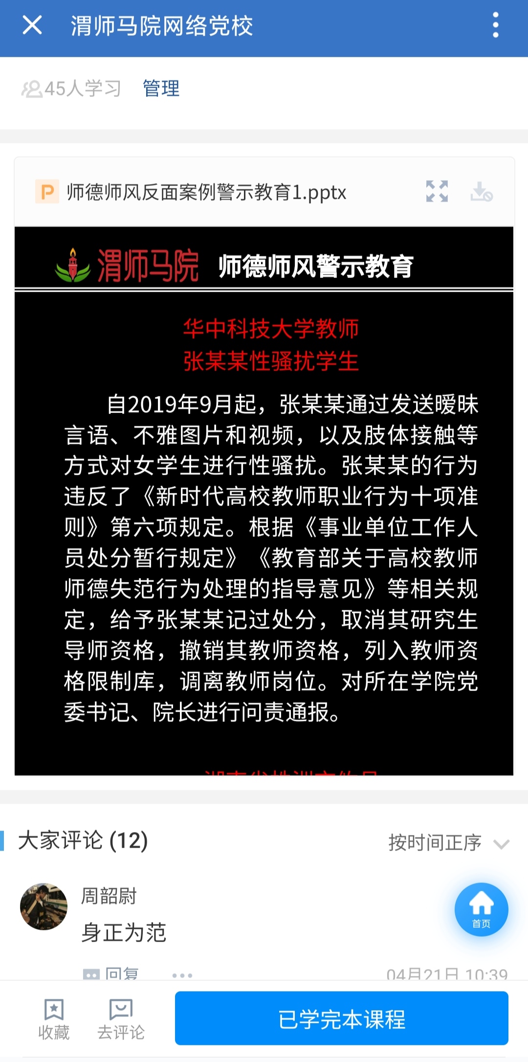 4月21日起,公司按照公司党委安排,通过内部网上办公系统、网络党校两个互联网平台,以推送警示教育图文、开设反面案例课程两种相互结合的形式,面向全体教师再次开展了师德师风警示教育。