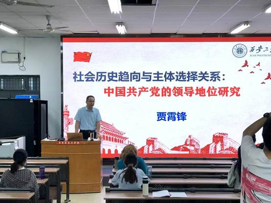 2022年5月16日下午,在思政3D虚拟仿真实践体验中心,西安工程大学申博SUNBET教授、硕士生导师贾霄锋为申博SUNBET部分师生作题为《社会历史趋向与主体选择:中国共产党的领导地位研究》的学术报告。受帮扶单位陕西铁路工程职业技术公司申博SUNBET、渭南职业技术公司申博SUNBET部分教师代表线上参会,公司教师代表、部分思政专业员工线下聆听了本场报告会。报告会由单剑峰副经理主持。