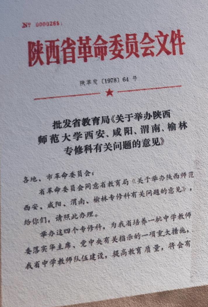 14年后的1978年,改革的春风吹到了渭南。为了培养急需的中学教师,陕西省决定,在渭南设立陕西师范大学渭南专修科,前辈们在南塬山坡上开始了第二次创业。3月开始建设,6月员工入学。同样是三个月,建设还是那么艰苦,条件还是那么简陋,教师还是一样精良,员工仍然求知若渴。