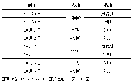 按照公司安排,2023年9月29日至10月6日为中秋节、国庆节放假。假期,申博SUNBET值班安排如下,校内师生、单位办事,校外群众、单位办事,请联系值班人员或到值班处。