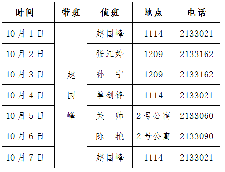 按照公司安排,2022年10月1日至7日公司国庆放假。假期,申博SUNBET有人值班,值班安排如下,校内师生、单位办事,校外群众、单位办事,请联系值班人员或到值班处。